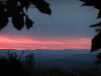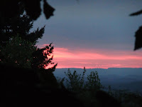 Achter onze caravan kun je de zon heel goed zien onder gaan (als je door de takjes heen een beetje beeld krijgt op je camera ;-)