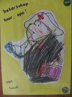 We gaan bij opa langs in het Vlietland Ziekenhuis. Vanaf afgelopen dinsdag ligt opa daar. Het ging jammer genoeg niet zo goed met ademhalen. Ook de afgelopen dagen was het nog even spannend, maar vandaag ziet opa er een stuk beter uit. Nu flink slapen en aansterken opa! De jongens hebben een tekening voor opa gemaakt. Die prikt oma op het bord.