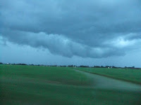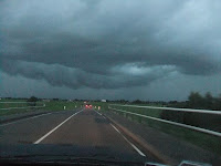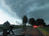 Wanneer we uit Zwijndrecht wegrijden zien we in de verte donkere onweerswolken. Hoe dichter we bij huis komen...des te dichter de wolken dichterbij komen. Bijna thuis begint het te regenen en te flitsen. Thom zit al weer met zijn vest over zijn hoofd in de auto en Luuk heeft het over dat je buiten wel moet uitkijken dat je niet geraakt wordt door de bliksem hoor! Eh...zou het onweer in de vakantie toch zijn impact hebben gehad?