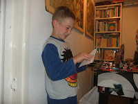 Het is vandaag 9 september, de verjaardag van Thom!! Van ons krijgt Thom een tafelvoetbalspel. In de vakantie heeft hij laten zien dat hij hier goed mee uit de weg kan ;-) Het past nog net boven in het kleine zolderkamertje... Het grappige is dat de tafel al een week in huis is, weliswaar in stukken, maar niemand zich heeft afgevraagd wat er nu onder het groene kleed zou zitten??? Vanochtend kan Thom zijn kado uitpakken. Op de vroege ochtend zijn er ook al gelijk 2 kaarten voor Thom...dat is een vroege postbode...een kaart van Leen en één van opa en oma Hier.