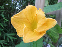 En de pompoenplant heeft een mooie gele bloem...maar pompoenen??? En dan hebben we natuurlijk nog ons eigen tuinmonstertje...