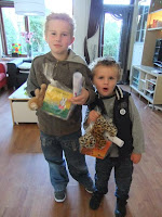 "Ik ga een herfsttafel maken!!!"gilt hij wanneer hij met zijn voorraad binnen komt rennen. Het is even zoeken naar een plekje, maar de rode schaal vindt hij wel een mooi plekje.